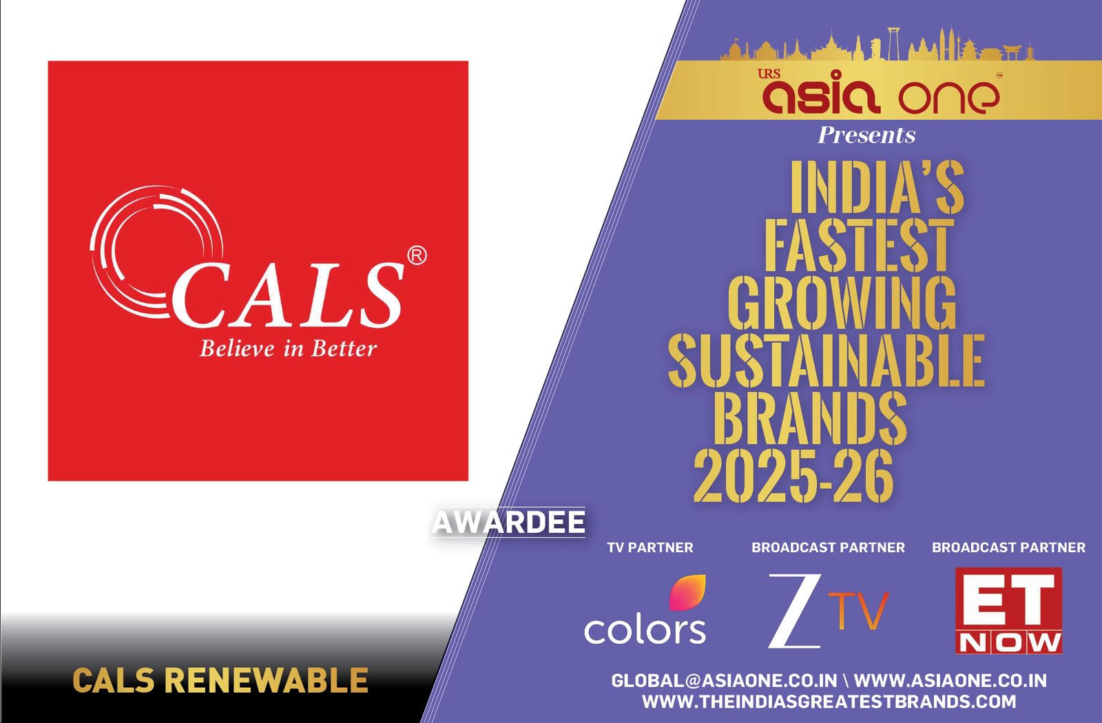 CALS Renewable Energy India Honoured as India’s Fastest Growing Sustainable Brand 2025–26 by AsiaOne Magazine